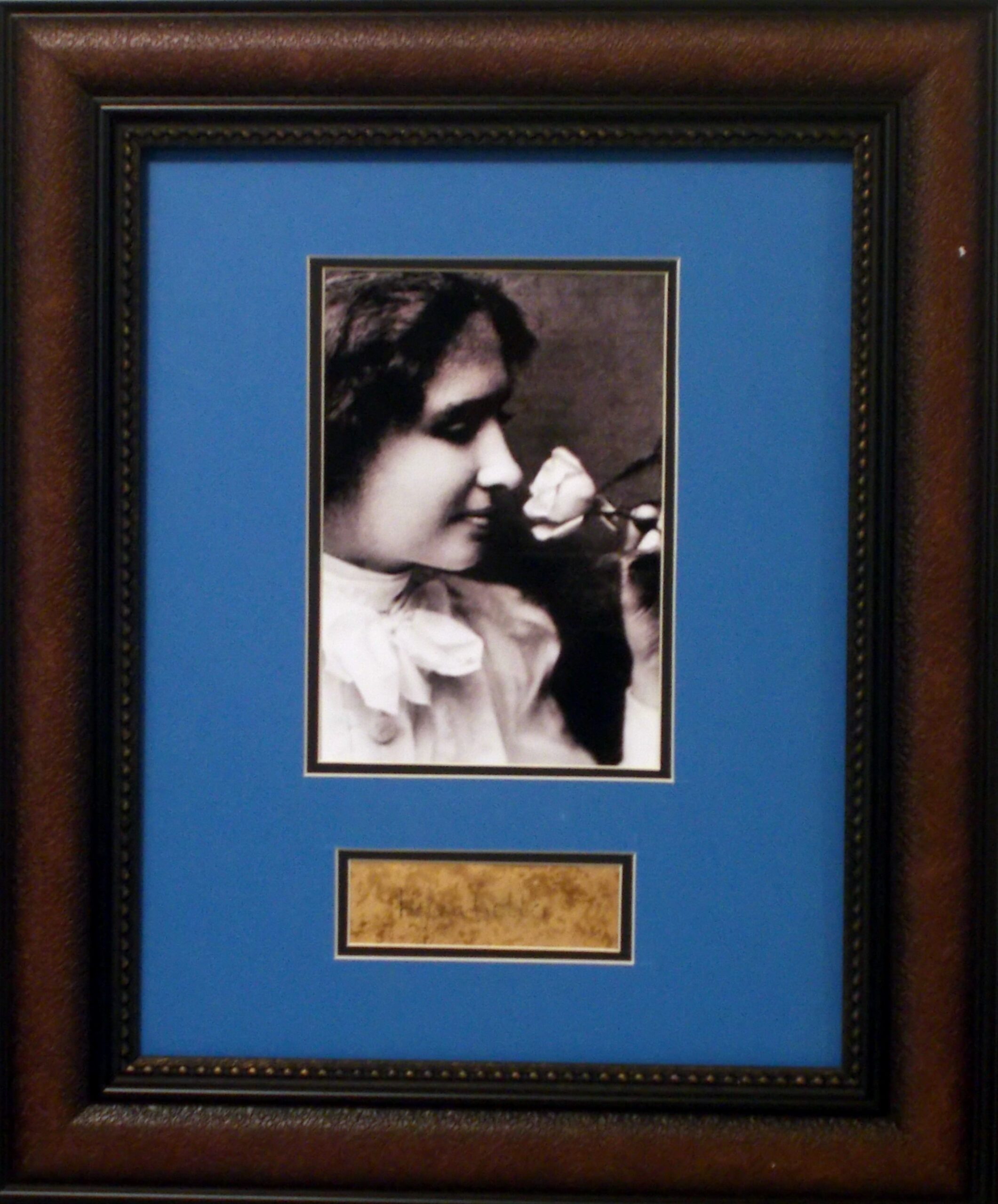 Helen was an American author, political activist, and lecturer. She was the first deaf-blind person to earn a Bachelor of Arts degree. The story of Helen Keller and her teacher, Anne Sullivan, was made famous by Keller’s autobiography, The Story of my Life, and its adaptations for film and stage, The Miracle Worker. Her birthplace in West Tuscumbia, Alabama is now a museum. Her signature shows wear and aging but is seen clearly in person. It is double matted with a great photo of Helen, framed to 11×14 and ready to hang. Comes with a COA for a forensic handwriting expert and guranteed for life.